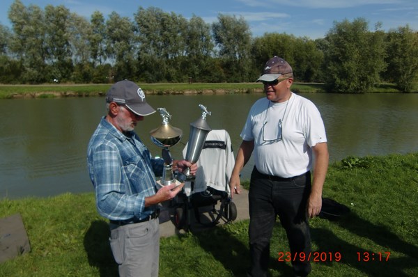 - Leo Peters met de bekers voor de vrije hengel wedstrijd, de 50+ wedstrijd en de zomeravondwedstrijden. Hiermee is Leo dan ook uitgeroepen tot koning van 2019.